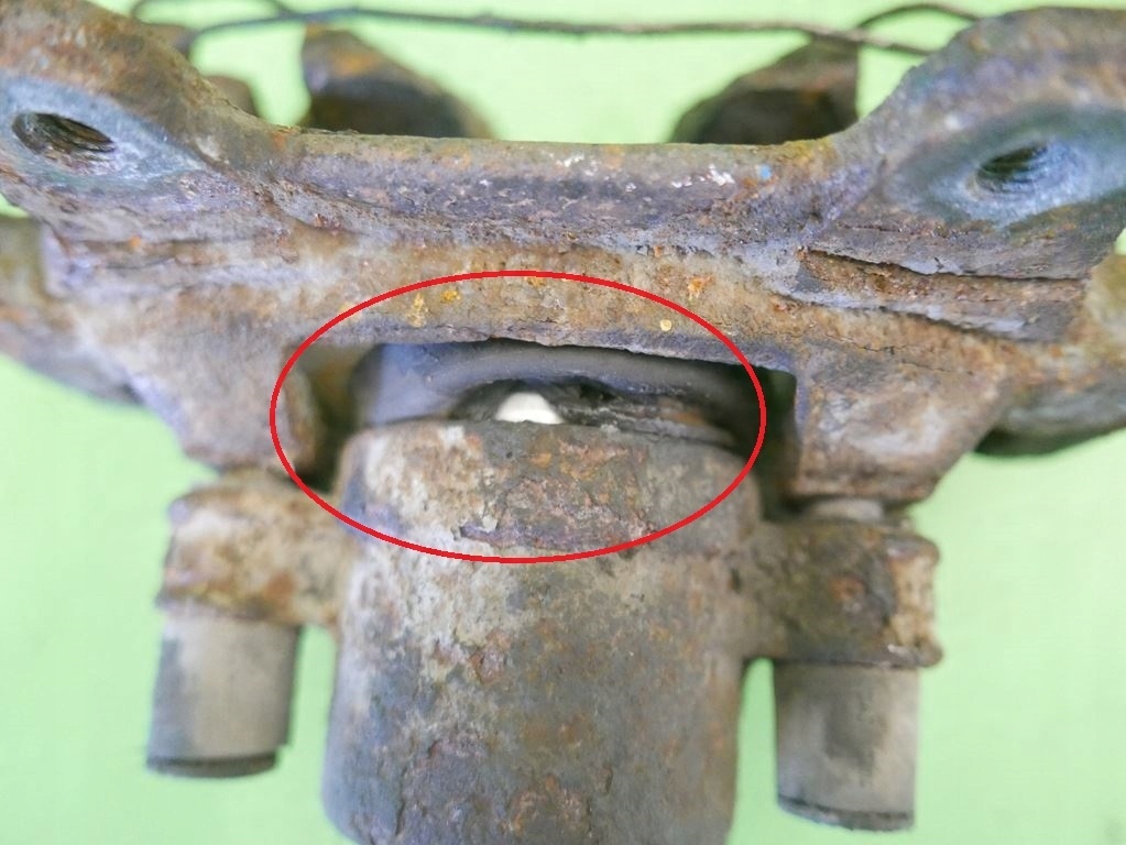 STATE: . The caliper has been checked, the breather is unscrewed, the rubber on the piston is damaged. Used part, reusable.