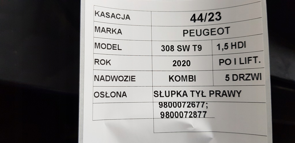 Column cover rear right Peugeot 308 SW T9